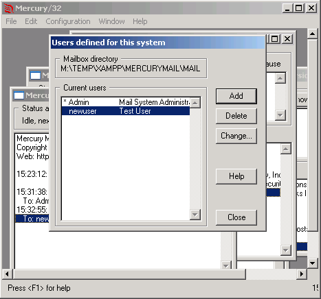 - to test, please send a message to postmaster@localhost or admin@localhost and check for these messages in the following folders: \xampp\MercuryMail\MAIL\Admin;